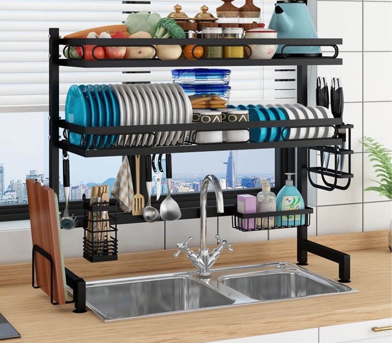 Kệ để chén / bát / đĩa đa năng trên bồn rửa chén giúp tiết kiệm không gian, tiện lợi trong quá trình rửa chén và ráo nước cho các đồ dùng phòng bếp nhanh chóng. Được làm từ thép carbon, sơn tĩnh điện giúp chống gỉ và trầy xước. Đầy đủ phụ kiện như đựng đũa, dao, thớt, đồ rửa chén, móc treo… với sự lựa chọn 1 tầng và 2 tầng phù hợp cho nhiều nhu cầu tuỳ không gian