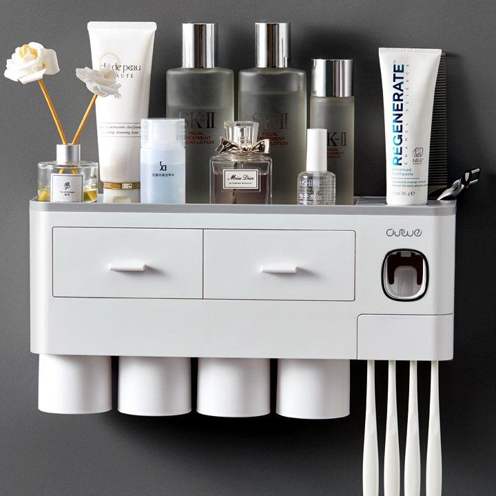 Treo được 4 cốc. Treo 4 bàn chải đánh răng. Có rãnh đựng dao cạo râu, lược chải tóc. Hộp dễ dàng tháo lắp để vệ sinh. Miếng dán công nghệ mới, siêu chắc và bền theo thời gian(Không lo tự dơi như các miếp hút chân không thông thường). Chất liệu nhựa ABS, PP siêu bền và đẹp